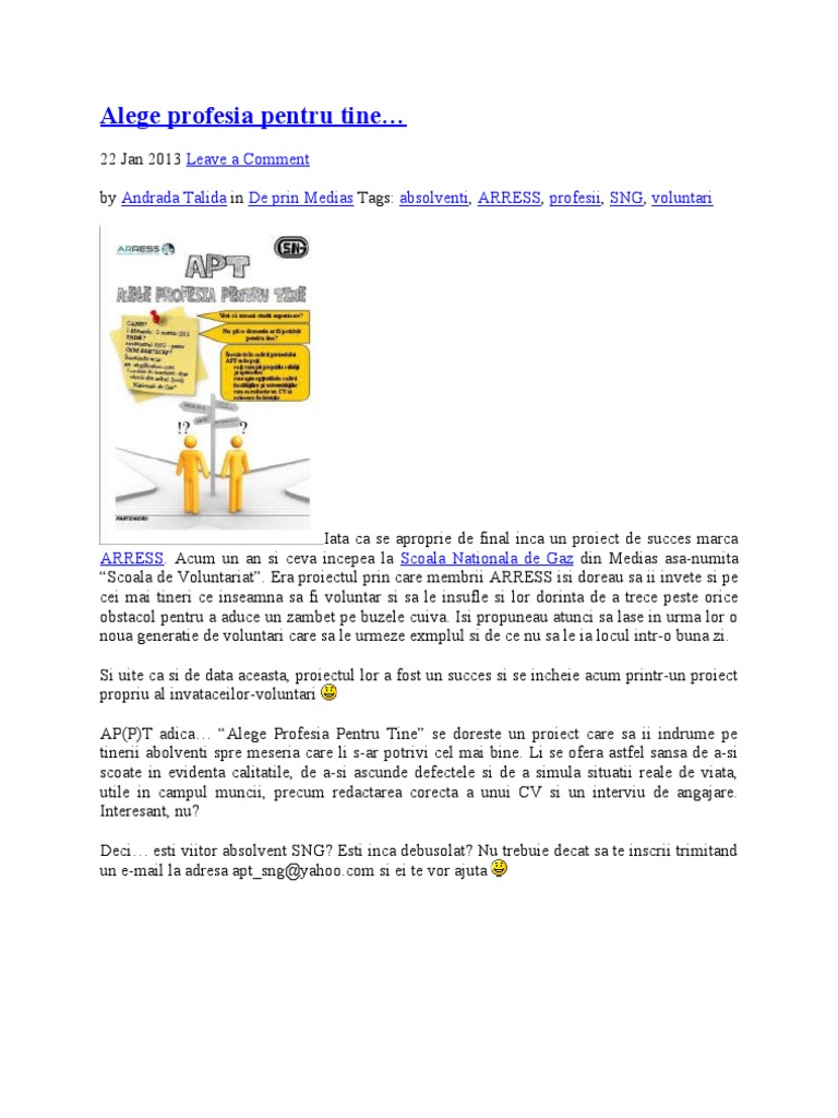 Alege Profesia Pentru Tine Leave A Comment Andrada Talida De Prin Medias Absolventi Arress Profesii Sng Voluntari