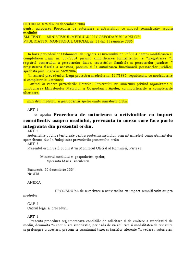O 876 2004 Procedura De Autorizare A Activitatilor Cu Impact Semnificativ Asupra Mediului