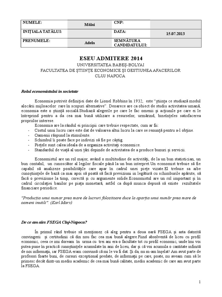 Eseu motivațional stimată comisie de evaluare subsemnata n f domiciliată în bucureşti îmi doresc să fiu admisă la specializarea marketing din cadrul academiei de științe economice dintr o sinceră dorinţă de avansare şi dezvoltare personală. Zilele acestea am fost întrebată de multe persoane cum se face un eseu motivaţional pentru înscrierea la academia de studii economice. Academia edu is a platform for academics to share research papers.