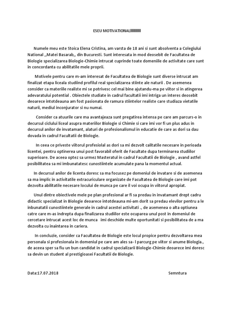 Puterea exemplului și afecțiunea investesc membrii familiei cu rolul de educator. Academia edu is a platform for academics to share research papers. Foarte util acest model va multumim. As vrea sa stiu daca am nevoie de mai multe dosare sau de mai multe eseuri motivationale mie unu mi se pare putin tras de par sa pun intr un singur eseu motivational 4 optiuni asa ca as vrea daca se poate sa imi explicati dvs sau orice altcineva care stie cum sta treaba de fapt.