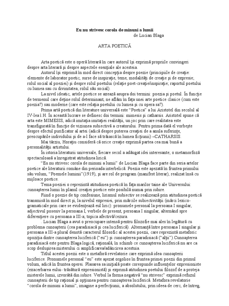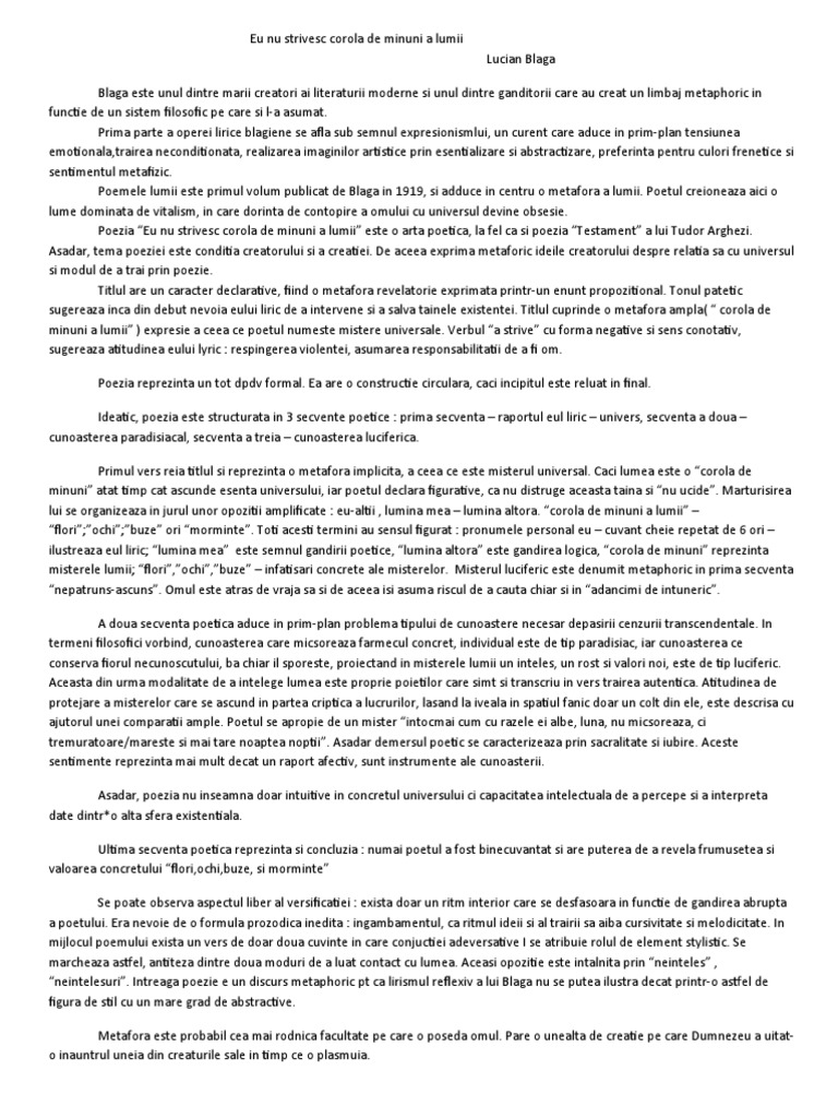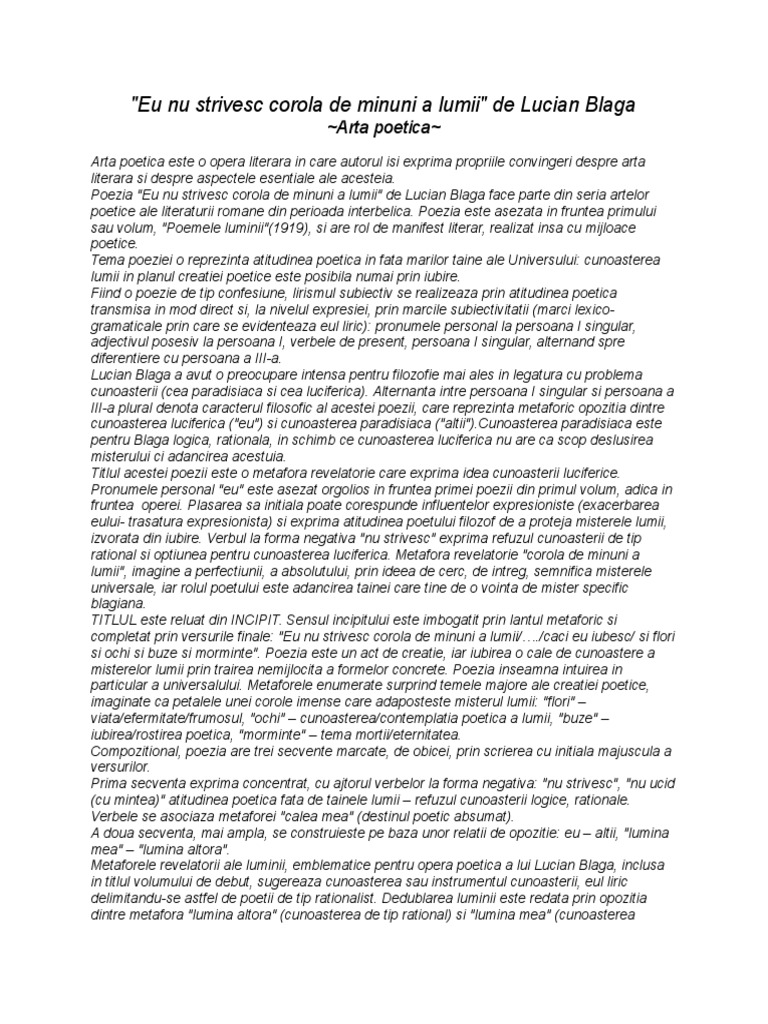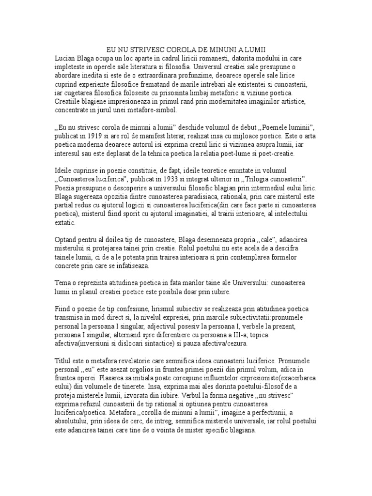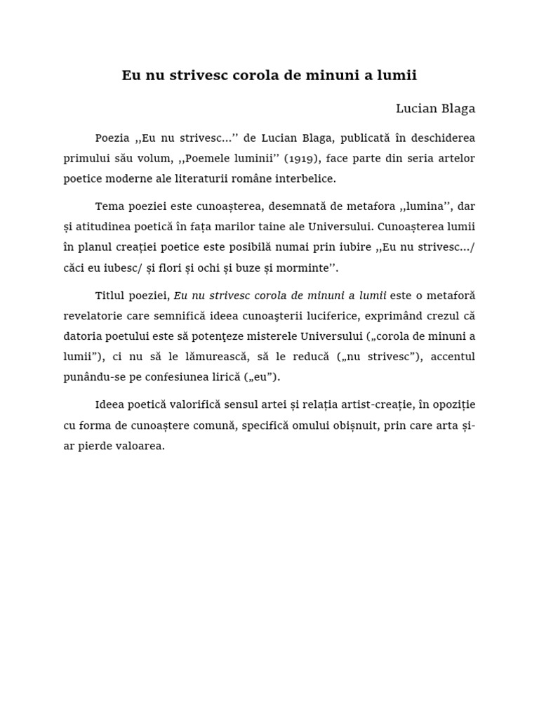 Eu Nu Strivesc Corola De Minuni A Lumii Comentariu Literar