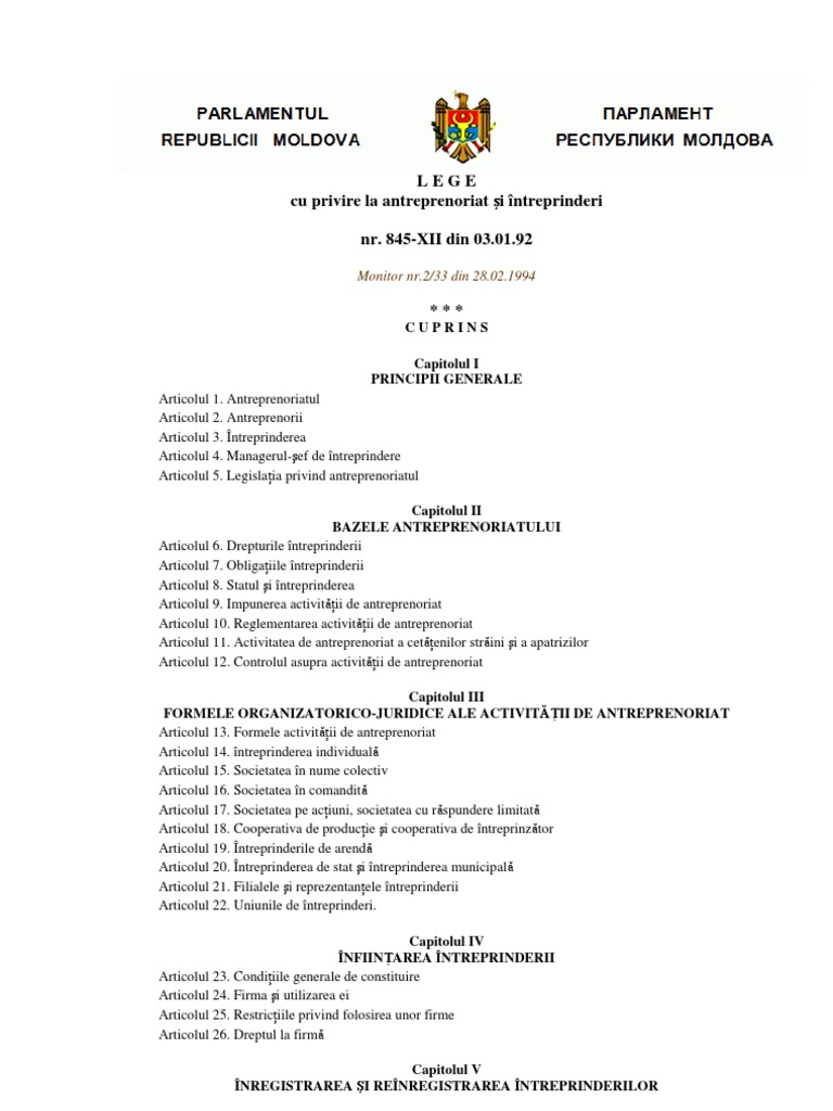 Legea Cu Privire La Antreprenoriat Si Intreprinderi